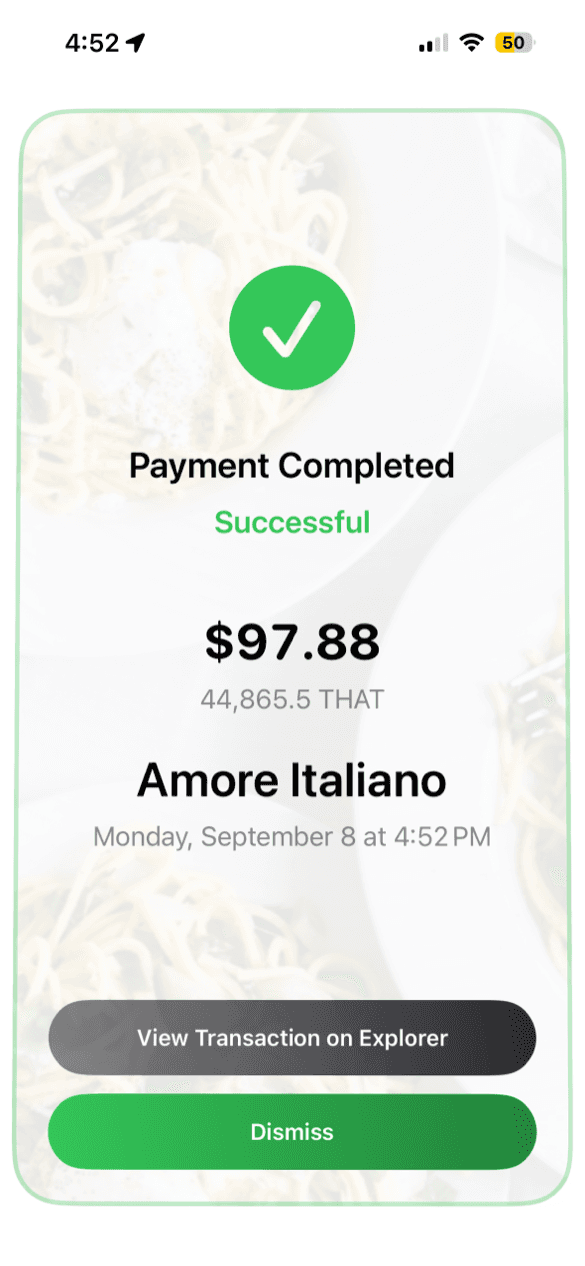 The THAT Wallet is a self-custodial wallet that allows customers to pay with their THAT at participating merchants. Customers fund their wallet with THAT and simply scan your QR code in-store to pay.