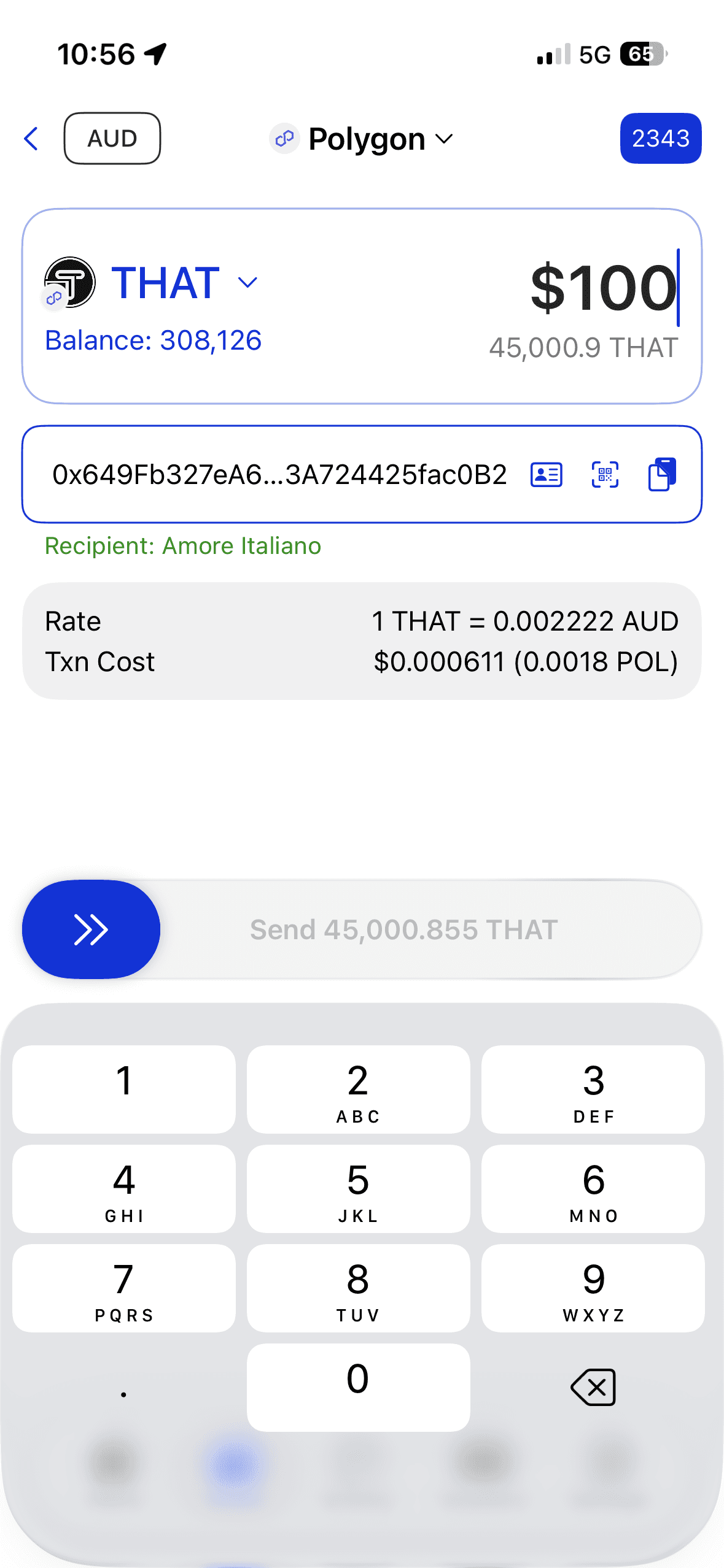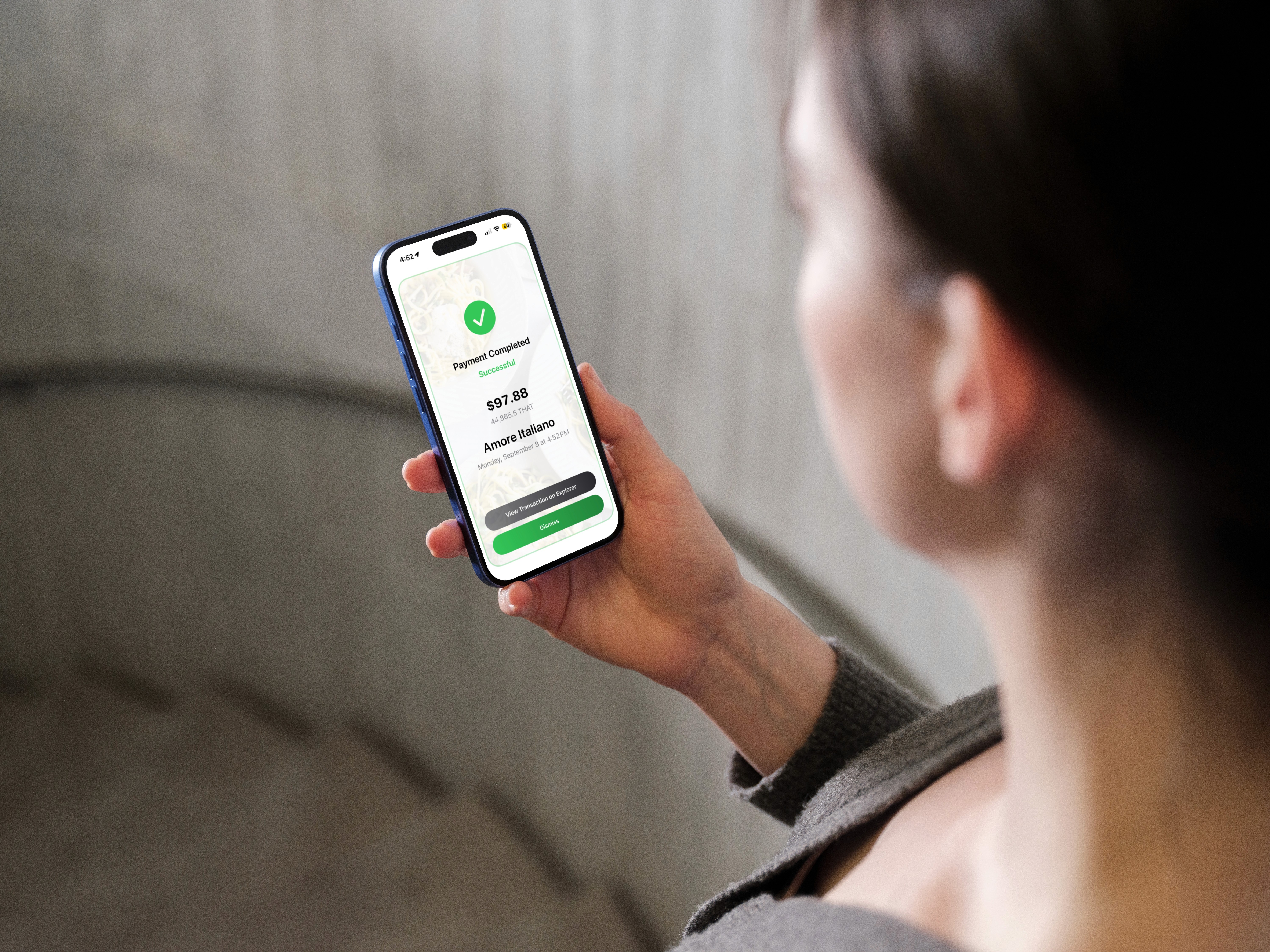 The customer enters the amount into their THAT Wallet, scans your QR code, and swipes to send.